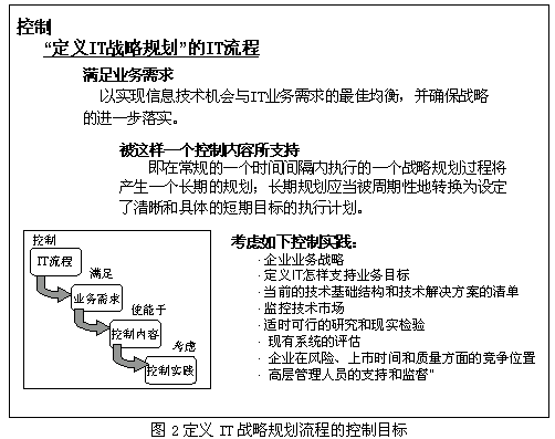 (2)对已经定义的每个IT服务流程都设定一个高层次的控制目标,并以7个信息准则(效果、效率、可用性、完整性、保密性、可靠性和兼容性准则)进行监控,监控过程中做到: ●找出在这个IT流程中哪条信息准则最重要? ●阐明流程运作中,通常哪些资源需要被均衡? ●考虑什么是控制那个IT流程最重要的因素? 例如,对于“定义IT战略规划”这个流程,它的高层控制目标定义如图2: