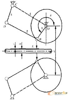 如果采用传统的手工计算,设计人员首先要做出机构简图,并套用各种力学公式及平面几何的概念求解结果,然后再根据结果描绘所需各种曲线。由于模型已简化为最基本的杆单元,且还有计算工程中数值近似取整等问题,造成得出结果只能作为一个理论值,和实际设计要求还有一段距离,所以通常计算得出的结果安全系数要大于等于10(安全系数因企业设计要求不同而不同,这里所列出的只是笔者企业所采用的数值),才能放心使用。同时因为传统算法,手算量大,易出现人为计算纰漏,最终造成设计误差。曲柄飞剪机的机构示意图如图2所示。