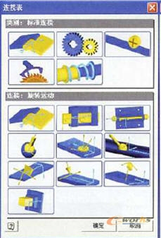 接着进入仿真环境,工具栏中的第一个命令可用来给零件问添加包括铰接在内的各种运动连接条件,如图5所示。我们也可以使用“继承装配”的功能把装配中的对齐、配合和插入等装配条件自动转成运动仿真中的连接条件。这里应该注意的是装配中的角度约束问题,过度和运动约束是不可以转换的。