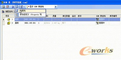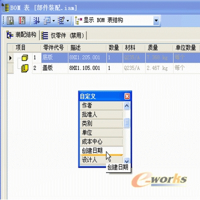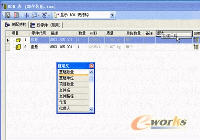 2、在“标准”工具栏上,单击“工具”“BOM表…”,弹出“BOM表”窗口,在该窗口中,我们可以依据自己公司材料明细表的样式,添加相应的列。例如增加“创建日期”列。