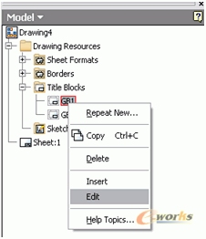1)在浏览器(Browser Bar)中,可以通过两种方式定义标题栏:一是定义全新的标题栏:右键单击“Title Blocks”项,在弹出的右键菜单中,选择“Define New Title Block”, 如图3所示;二是在已有格式的基础上更改,如选中已有模板GB1,在右键菜单中选择“Edit”,如图4所示。