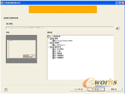 3、程序读取源文件中工程图资源(如边框、标题栏和略图符号),并将这些资源显示出来,等待用户的下一步操作,用户可以根据自己的需要,勾选相应的栏目进行更新。在本例中,全部勾选。