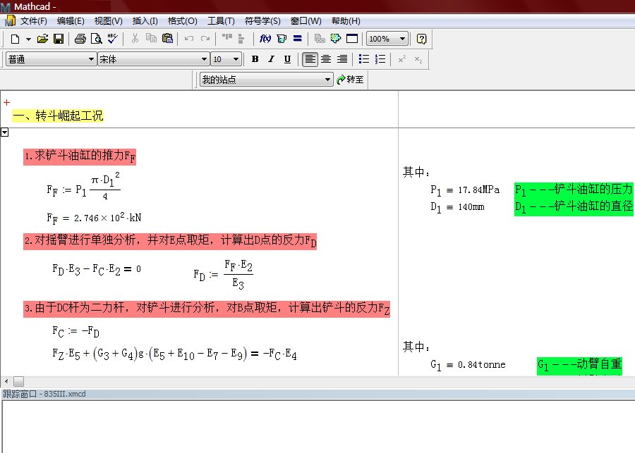 MathCAD应用在设计说明以及计算,该软件可以直接像说明书一样编写,列出计算公式、说明等。给出输入参数,软件通过编写好的计算公式自动的给出设计计算结果。MathCAD可以直接与Pro/E集成,其输出计算结果可以直接驱动Pro/E的三维模型中的重要尺寸参数,而且可以实时的更新。设计的效率和准确性得到大大的提高。