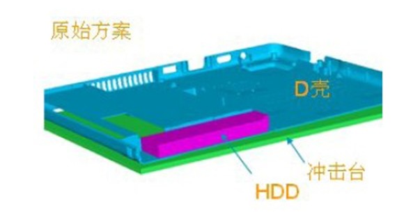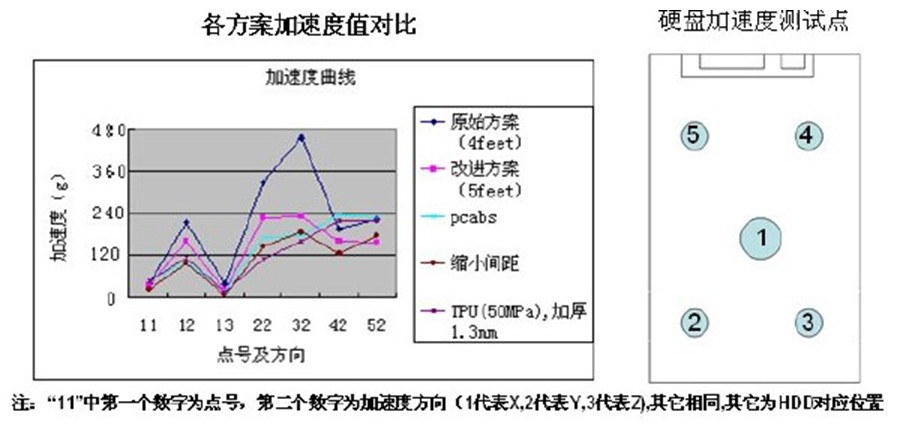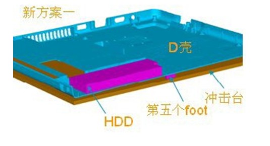 结果:由于增加了第五支胶垫,对D 壳产生了缓冲作用,大大降低了硬盘加速度;