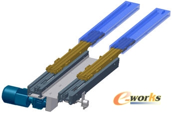 由于本公司生产的堆跺机用伸缩货叉结构简单,使用可靠,对于一般精度应用场合又有较大的价格优势,所以接到欧洲客户订单,在尽可能保持原有货叉结构的基础上将货叉安装位置由中间换到一侧,并希望我们能尽快完成。但现有货叉的传动方式决定了安装位置不能产生变动,重新规划传动链成为了研发重点。货叉在整个堆跺机中属于精度最高的部件,因为零部件较多,结构设计紧凑,改动后运动产生干涉的可能性也最大,为了避免制造装配出现较大问题,特采用了三维建模模拟运动检验的方法。