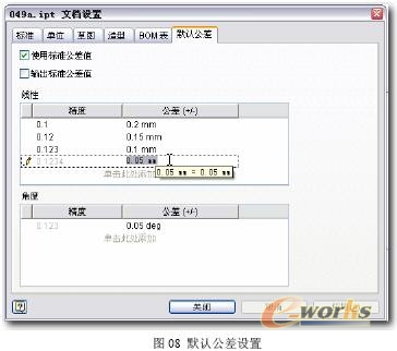 对于自由公差,Inventor并未提供直接的支持功能。不过在Inventor中有个与这种需求类似的机制,启用方法是在菜单中:“工具”→“文档设置”→“默认公差”选项卡,参见图08的界面。其中设置了四种精度的线性尺寸默认公差,并打开“使用标准公差”开关。