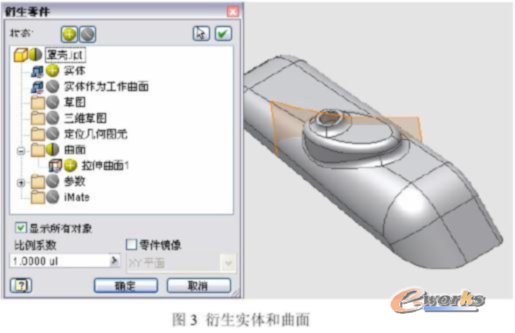 3. 新建零件罩壳左.IPT,衍生零件“罩壳.ipt”的实体和曲面,参见图3;