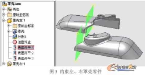 7. 分别使用“表面平齐”的方式约束左、右罩壳零件的坐标系平面(XY、XZ和YZ),参见图5;