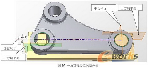 在“零件.IPT”两个孔的上下方创建各自的切平面和主定位孔中心平面,之后将两个定位销与孔的切平面做出相切装配约束,参见图19和“定位误差.IAM”。