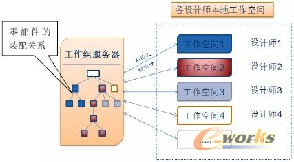 在图1中,可以清晰的看到在半隔离项目中,工作组服务器和各个设计师本地工作空间的数据交互的关系。左边工作组服务器上的树状图就是一个零部件的装配关系,每位设计师负责其中相应颜色的零件设计,可以同时进行。这是一个简单的产品设计方面的并行设计的样例。后文会给出产品设计与夹具设计等进行并行设计的实例。