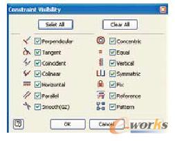 位于图形窗口里的关系型菜单上的全新「约束可见性」控制功能提供各个约束类型的复选框,让设计工程师可以个别控制各个约束类型的可见性。