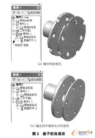 | | 0前言 众所周知,CAD三维造型技术的发展经历了线框造型、曲面造型、实体造型以及参数化造型等几个阶段。当前的主流三维CAD系统的技术特点可以概括为"基于特征的、参数化实体(曲面)建模"。但是很多CAD使用者在进行部件设计时常常发现,仅仅进行独立的零件造型,然后将这些零件装配起来,并不能满足特定的功能需要。即无法在部件环境中根据部件的特性要求创造零件的形状。 Inventor是Autodesk公司最新的和最现代的基于Microsoft Windows的机械设计系统,是一种包含了最新技术的基于特征的参数化实体造型软件。最新版本的Autodesk Inventor提供了高性能的机械工程和设计软件,独一无二的易用性简化的用户界面、高级帮助与支持系统以及内置的移植工具,使Autodesk Inventor成为AutoCAD用户最易学习和使用的机械设计软件。与其他三维CAD软件相比,Inventor的一个突出的技术优势就是自适应功能。自适应技术充分体现了现代设计的理念,并且将计算机辅助设计的长处发挥到了极至。 1 自适应设计原理 自适用功能简言之就是利用自适应零部件中存在的欠约束几何图元,在该零部件的装配条件改变时,自动调整零部件的对应特征以满足新的装配条件。在实际的零件设计中,自适应特征可以根据装配约束的条件,来自动改变自身的草图大小和特征大小以满足约束的限制;在部件中,装配约束可根据其他零件来定位自适应零件的一些尺寸,并根据完全约束的零件来调整零件之间的拓扑结构。 1.1使用参考草图创建基本特征 在工程设计中,有时相配合的零件会有相似之处,如箱子和盖子、法兰盘和垫片等。当箱子或法兰盘频繁改动时,与之相配合的零件也必须做相应修改。零件复杂时,这是件烦琐的事。为了简化操作,Autodesk Inventor提供了使用参考草图创建自适应零件的设计功能,具体就是在部件中设计新零件时,可以将一个零件的几何图元投影到草图平面上,形成参考草图,再在参考草图的基础上建立新的零件。这样新的零件就和源零件通过参考草图保持一种链接,当源零件改动时,新零件也会相应变化。 参考草图是通过将部件中已有零件的表面投影到新草图上定义的。参考草图保持着与源零件投影面的链接,当修改源零件,参考草图中的投影几何会自动地反映出边界的变化。在返回到部件环境时,从参考草图创建的零件边界也会自动更新,与部件中已有零件保持一致。 如图1所示,需要为其中的套筒零件设计一个盖子。先将套筒端面的外圆和孔投影到新草图上,参考草图中的几何就会保持与套筒端面的链接,盖子通过拉伸草图而得到。显然盖子是自适应的,当零件的端面发生变化时,盖子会随之变化,如图2所示。   需要注意的是自适应零件设计的前提是在位创建零部件。在位创建的零部件与放人现有的零部件结果是完全一样的,只有在位创建零部件,才有可能实现零部件的几何图元之间的关联,零件才可以产生自适应性。所以,自适应零件的设计都是在部件环境下通过在位创建零部件方法产生的。 当使用参考草图创建零件时,参考草图、草图、从该草图创建的特征及零件都会变成自适应,当不需要零件的自适应特性时,可以通过两种方法控制: 1)在浏览器中,在零件或特征上单击鼠标右键,关闭它的自适应性。两者的区别是关闭零件的自适应时,零件中每个特征的自适应都被关闭,而当关闭某个特征的自适应时,只能关闭该特征的自适应。 2)有时尽管特征的自适应被关闭了,但参考草图与源零件之间的链接依旧存在。这种链接有时仍旧会影响其他特征的自适应调整,所以要删除链接。可以在参考图中选取相应特征下的"参考尺寸",单击鼠标右键,关闭链接。
