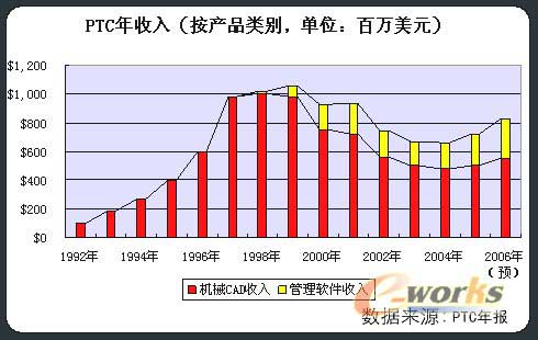 自从PTC的参数化设计技术风靡以后,这项技术逐渐被CAD厂商广泛采用,SDRC公司更以参数化技术为蓝本,提出了变量化技术,因此,PTC的三维CAD方面的优势逐渐显得没有那么突出。2000年,随着以SolidWorks为代表的中端、Windows平台三维CAD软件的兴起,Pro/E的市场受到了比较大的冲击。此后的5年,PTC的年收入有一定程度的下滑。