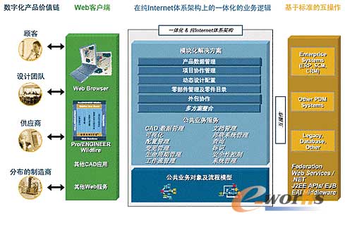 Windchill从诞生开始就是基于WEB的,随后收购的InPart(ASP 模式的三维零件库提供商)、DIVISION(仿真、协作厂商)实际上也都是为了能实现更好的Internet应用。另外,PTC在2005年发布的Pro/INTRALINK