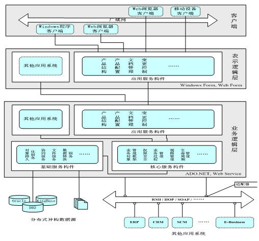 产品全生命周期管理(Product overall DATA/Lifecycle Management)是当代企业面向客户和市场,快速重组产品每个生命周期中的组织结构、业务过程和资源配置,从而使企业实现整体利益最大化的先进管理理念。PLM是针对制造业的扩展型企业解决方案,以便于在公司的各个部门、用户、供应商之间共享产品数据。PLM可以从企业资源计划(ERP)、供应链管理(SCM)、客户关系管理(CRM)系统中提取相关的信息,并使之与你的产品知识发生关联,进而使之用于你的扩展型企业,使从制造到市场、从采购到支持的所有人都能够更快速、高效地工作。这样就允许在公司间的整个网络上共同工作来进行概念设计、产品设计、产品生产、产品维护,对整个网络的操作就像对一个单独的机构操作一样。PLM允许扩展型企业在公司间共享产品的业务流程和产品知识,包括从提出概念到产品退出市场整个生命周期的各个阶段。 目前,现有的CAX、ERP、SCM、CRM、eBusiness等系统,主要是针对产品全生命周期中某些阶段的解决方案,难以支持企业作为一个整体来获得更高的效率、取得更多的创新以及满足客户的特殊需求,迫切需要一种将这些单独的系统结合到一起的企业信息化策略。 PLMS的技术定位是为上述分立的系统提供统一的支撑平台,以支持企业业务过程的协同运作。 从逻辑上看,PLMS为不同的企业应用系统提供统一的基础信息表示和操作,是连接企业各个业务部门的信息平台与纽带,PLMS支持扩展企业资源的动态集成、配置、维护和管理。 企业应用系统(如:CAX、ERP、SCM、CRM、eBusiness等)都依赖于PLMS,并通过PLMS进行连接和集成。企业所有业务数据都遵照统一的信息与过程模型被集成到PLMS中;扩展企业的所有部门都能够通过PLMS获得信息服务。 1.1 TiPLM系统架构 1.1.1 系统逻辑结构 PLM系统的软件体系结构设计必须能够支持在异构环境下基于容器的构件化设计,且具有跨平台能力。本项目采用Microsoft.NET平台作为PLM系统技术支撑平台。并结合COM+的成熟技术作为PLM系统的运行环境。不仅具备事件发布和订阅,零客户管理、SSL、X.509、ACL安全控制和文件服务等功能,更支持XML等最新的Internet应用技术。  PLM系统网络结构及部署与传统的客户/服务器(C/S)模型是一种包括客户层、中间层和企业信息层的多层结构。分层方法可以将企业业务逻辑与客户视图分开,极大地增强了企业应用系统的扩展性、健壮性和可维护性,使得开发者能迅速改变原有的企业应用逻辑,并将新的应用系统插入到该平台中,从而使得企业能适应迅速发展的业务环境。 表示逻辑层 表示逻辑层负责产生PLM系统的用户视图,并为浏览器客户提供相应的页面显示、定制和用户交互。表示层包括各种显示模块,如:权限和用户视图、产品文档数据视图、产品配置视图等。表示层并不实现企业的实际业务逻辑,只是作为用户和业务之间的纽带,为用户生成用户视图和交互界面。企业业务逻辑的实现是在业务逻辑层完成的。 业务逻辑层 在业务逻辑层,通过开发各种分布式软件构件来实现PLM系统在业务逻辑上的需求,这些构件覆盖了PLM系统各个功能层次上的全部功能设计。 企业信息层 企业信息层包括数据库系统、扩展企业信息系统,如CAD、CAPP、MRPII/ERP、SCM、CRM等。PLM系统与扩展企业其他信息系统的集成既可以在数据级,也可以在应用级。 1.1.2 功能逻辑结构 TiPLM系统在功能上划分为三个集中式管理服务构件集和一个资源集成与信息服务平台。三个构件集包括:信息服务构件集,资源管理构件集和过程监控构件集。这三个服务构件集分别从信息、资源和过程三个方面为扩展企业提供产品全生命周期管理所涉及到的全部核心功能和应用功能。 信息服务构件集为扩展企业提供基础信息服务,如:模型服务、视图管理和知识管理等,还提供了一些基本的领域应用信息服务,如:电子仓库、目录服务、零件分类服务、产品结构等。除此之外,信息服务构件集还为资源管理构件集、过程监控构件集提供系统信息和过程信息服务,为资源部署与信息网格平台提供资源连接和汇集方面的信息服务。  功能结构图 资源管理构件集为扩展企业提供一个资源集成环境,并对所有被集成到资源部署与信息网格平台上的资源进行管理。主要功能包括:资源部署、资源配置、资源定制、动态联盟和系统安全等功能。 过程监控构件集为扩展企业提供协同工作的环境,监控资源的运行过程和状态。主要功能包括生命周期管理、工作流管理、变更控制、项目管理等功能。 资源集成与信息服务平台:在三个服务构件集的基础上,基于XML的信息网格协议(如:SOAP、WSDL、UDDI等)来包装、发布、组织和管理扩展企业的资源和信息,实现扩展企业资源的动态部署、连接和信息交换。扩展企业资源和信息沿时间和空间两个方向展开,构成一个逻辑上的网格。扩展企业的资源和信息部署在网格结点上,网格结点之间的连线表示扩展企业资源之间的相互关系。资源部署与信息服务平台的作用主要包括两个方面:一方面,通过在标准的信息网格协议的基础上,采用松偶合的方式,动态地建立和维护核心企业与各协同企业间面向产品价值链的资源和信息关联关系。另一方面,部署在网格平台上的各个结点也是企业提供信息服务的入口。 1.2 TiPLM系统技术特点 1.2.1 可支持集团型应用和分布式部署 TiPLM系统