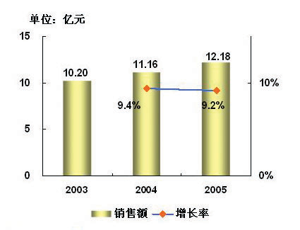 2003年中国CAD/CAM软件市场销售规模为10.2亿元,2004年市场销售规模为11.16亿元,同比增长9.4%。2005年预计市场销售规模为12.18亿元,比2004年增长9.2%。