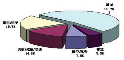 2004年,数字化设计软件产品(CAD/CAM等)的应用依然主要集中在传统的制造细分行业,以通用机械/装备制造业为龙头,而建筑行业市场份额最小。这种行业结构对于已进入产品成熟期的CAD/CAM来说已完全定型,其中,通用机械/装备占到了52.7%,其余细分行业均在20%以内,航空/航天和建筑行业更是不足10%。