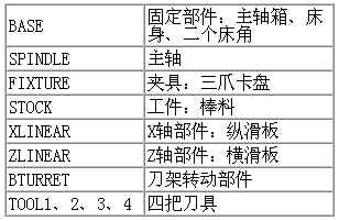 先添加工件、卡盘、主轴、四把刀具、刀架转动部分,其他再按配合关系加入。添加STL模型时应注意将模型TYPE选择为MODEL FILES类型,按BROWSE找到相应STL格式文件,NORMALS方向应设为OUTWARD。