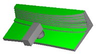 加工所用数控机床为INGSOLLAN卧式四轴联动铣床。X、Y、Z行程分别为:21m、6m、1.5m。铣头的转角为-200度~200度。所用铣刀是直径为350mm~630mm的三面刃铣刀。CAD/CAM系统是Mastercam。机床、工件及刀具的相对位置关系如图2所示。粗加工的主要问题是如何选择最优的加工方法,以最高的效率去除毛坯余量。并使一次走刀中的切削用量均匀,所留精加工余量也应均匀。绳槽底面的毛坯余量很不均匀(见图3),需要选择合理的走刀方式。粗加工的另一个关键问题是避免刀具与工件的碰撞。如图4所示,绳槽曲面的加工只能用OneWay的走刀路线。当刀具沿OneWay路线从起点铣到终点,再从终点快速回到起点时,不能在终点抬刀后直接沿直线回到起点。因为鞍座上的通道很窄,稍有抬刀就会碰到上半部分。必须采用图中实线所示的退刀路线。刀具铣完一次后,从终点完全退到零件外面,再从零件外面快速回到起点,做第二次铣削。