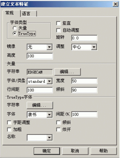 在使用中,我们在设计模式下完成文字的放置。文字的命令是:建模->文字。使用命令后,跳出“建立文本特征”对话框(图1)。这里可以看到EdgeCAM提供了两种文字,分别是矢量文字和TrueType文字,使用过程中,可以任选其一。