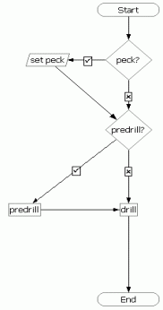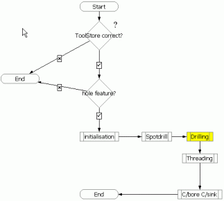 在此流程中,提供了数据节点、判断节点、注释节点、组节点等多种节点方式;当我们针对某些孔特征应用此加工策略的时候,软件系统将就按照这个流程自动处理,并生成刀具路径。流程图可以根据需要作成各种各样的结构,例如下面图示是上图中Drilling组节点中的内容。通过这种嵌套的方式使得加工策略的判断和加工能力获得进一步的加强。一旦根据需要完成了这个策略功能的设置,就使得加工所有孔特征的过程变成自动化。