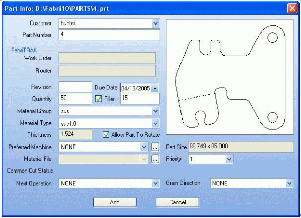 依次填写客户名称(Customer)、数量(Quantity)、填充数(Filer)、材料组(Material Group)、材料种类(Material Type)、指定机器(Preferred Machine)、优先级(Priority)、下一步操作(Next Operation)、纹理方向(Grain Direction),单击上图中添加(Add),系统将返回上一个对话框,继续添加零件。
