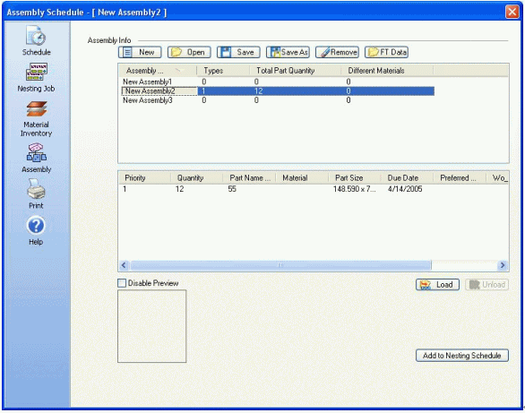 (2).智能排料(Intellinest)\组件(Assembly),单击新建(New)或打开(Open)一个组件,然后再单击加载(Load),加载这个组件所对应的零件。完成后,单击添加到排料计划(Add to Nesting Schedule)。