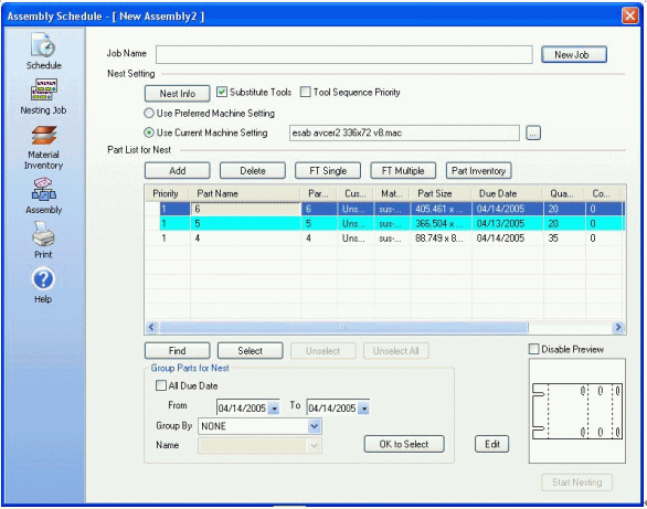 当有零件被选中后,单击开始排料(Start Nesting),系统将进行自动排料。排料完毕后将切换到排料任务(Nesting Job)中。同时材料库中将会保存创建的残料的信息。