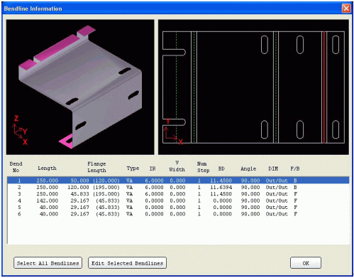从FabriWIN的接口导入文件后,系统出现如下对话框,左侧是该零件的三维视图,而右侧的则是该产品的展开图。下侧则是该零件的折弯信息。