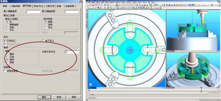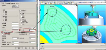 高速加工中,利用CAM软件进行编程时,生成的刀具路径形状至关重要,不仅要求减少极端换向的发生。同时要求考虑到机床主轴的负载情况,一定要在主轴完全启动达到最高转速后再切入毛坯材料。在编程过程中,CAM软件往往通过一些参数设置来达到上述目的。例如在CAM软件中,通常具有角部处理方式的参数选项(图三),从而保证自动生成的刀具路径不会出现急转弯的情况。型腔加工中,刀具路径通过“最小半径”参数保证了形成零件表面的最外侧圆角半径不会小于指定值,而中间去除余料部分通过“高速加工角部优化”参数保证圆角过渡,而不是急转弯换向。在加工型腔的过程中还有一点特别注意,切入时尽量选择螺旋导入,而不是摆动刀具导入毛坯。因为在刀具摆动过程中需要改变切削方向,这是我们不愿看到的。适当的延长刀具的导入距离还可以起到确保主轴完全启动后切入被加工材料的功效。