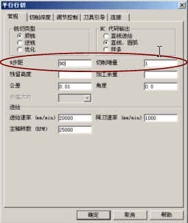 加工零件变形给很多的工程技术人员带来过巨大的烦恼;机加过程中的变形因素比较多,高速加工中,切削过程产生的热量大部分被切屑带走,而不是传递到工件中去,因此,可以有效的减少热变形。常规加工中,由于受刀具径向上的切削力的影响,会产生“让刀”现象,如果不注意,也会带来零件形状不准确。高速加工中,每齿切削量相对较小,可以有效的减少径向切削力的影响;但是并不是意味着可以一味地减少切削用量,在刀具高速旋转过程中,刀具切入零件会产生震动,由于刀具震动带来的负面影响反而更大;因此,在高速加工中,往往采用增大径向切深,减少轴向切削深度的方式来减少刀具震动。在编程软件中,一般是通过增大步距,减少切削增量的方式来实现,见图五所示。