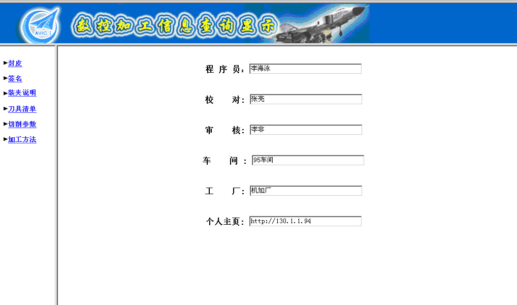 图1 生成如下网页格式的车间工艺文档  图2 5.2 车间工艺文档的功能拓展 5.2.1 封皮的功能 当我们点击封皮按钮时,显示的是图2所示,我们输入零件号,版本号,零件名字,点击保存按钮,获得如图3所示。  图3 5.2.2 签名的功能 点击签名按钮时,依次输入程序员,校对,审核,车间,工厂,个人主页,点击保存按钮,获得如图4所示。  图4 |