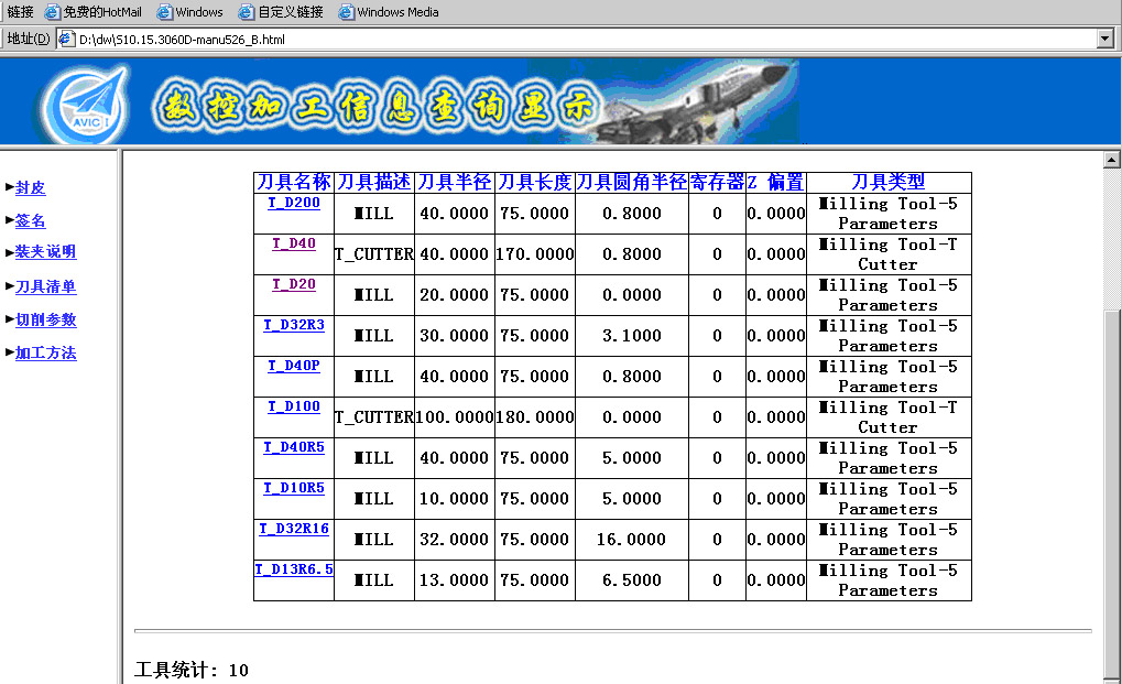 5.2.5.1点击每一Operation刀具名称链接时,显示出加工此 Operation时用到的刀具详细参数清单,具体见图8。