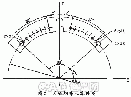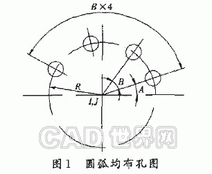 工 程 上 经常使用圆弧均布的联接孔,而这些孔在图样上往往是不给出每点的坐标,在编程时需要逐点计算,因而增加了编程员的工作量。圆弧孔可用极坐标来描述,若圆心不在坐标原点上,编程不太方便。现 在 有 的系统提供了圆弧均布孔位计算宏指令,可供直接使用。这里给出扇形面上的圆弧孔的宏程序的编制方法。
