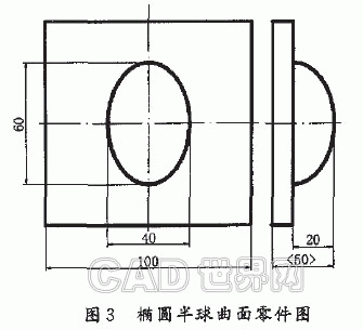 实 际 应 用中,还经常会遇到各种各样的椭圆形加工特征。在现今的数控系统中,无论硬件数控系统,还是软件数控系统,其插补的基本原理是相同的,只是实现插补运算的方法有所区别。常见的是直线插补和圆弧擂补,没有椭圆插补,手工常规编程无法编制出椭圆加工程序,常需要用电脑逐一编程,但这有时受设备和条件的限制。这时可以采用拟合计算,用宏程序方式,手工编程即可实现,简捷高效,并且不受条件的限制。加 工 如 图3所示的椭圆形的半球曲面,刀具为R8的球铣刀。利用椭圆的参数方程和圆的参数方程来编写宏程序。