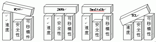 对于通用网络编程语言来说,三个必要的支柱是:可移植性、速度和安全性。图1表示了Java和其他语言进行比较的结果。