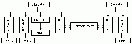 本文设计了一套NC嵌入PC 型的开放式数控系统。系统的控制轴数为3轴,联动轴数为2轴,本系统以工业PC作为主机,CNC的内核采用美国DELTATAU公司推出PMAC-LITE型可编程多轴运动控制器,PC 上的CPU与PMAC卡的CPU构成主从式双微处理器结构,两个CPU各自实现相应的功能,其中PMAC完成插补运算、位置控制、刀补、速度处理以及PLC等实时控制;PC则通过调用Pcomm32包函数库里的相应功能函数,实现数控系统的基本功能。为了实现PMAC多轴运动控制的功能,还需在PMAC板上扩展相应的I/O板、伺服驱动单元、伺服电机、编码器等,最终形成一个完整的控制系统。网络系统采用"服务器+ 客户机"方式,数控系统运行在服务器上,网络控制软件运行在客户机上,服务器和客户机通过网卡和通信电缆连接在Intranet/ Internet 上,数控机床上安装CCD 摄像头,用来监视机床加工情况,并通过图像采集卡,将机床的运转情况实时采集保存;服务器和客户机PC上均设置语音功能,以便二者通过对话能更好的交流。该系统硬件结构如图3 所示。