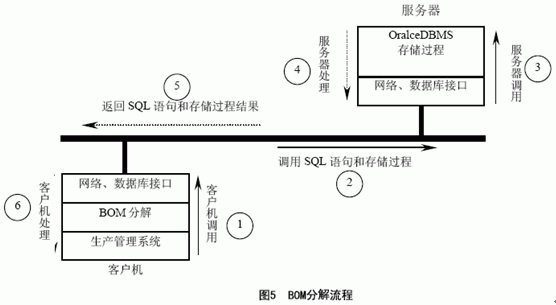 分布运算的数据处理流程大致如下:分解时,客户机生产管理系统调用本地BOM 分解公共函数,函数调用SQL 语句或服务器存储过程,服务器执行SQL 语句或存储过程,并将处理后的结果返回客户机,客户机再根据自己的业务需要灵活地对返回的结果进行进一步地处理,最后完成整个业务。 BOM 分解流程如图5 所示。 采用本方案进行BOM 分解,有以下优点: