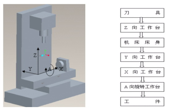 四轴联动加工技术主要应用于加工具有较为复杂曲面的工件,与三轴联动加工相比,四轴联动加工可以加工出更高质量、更复杂的曲面,主要适用于飞机、模具、汽车等行业的特殊加工,目前已经普及国产四坐标机床。如下左图所示四坐标立式NC机床是在三个线性平动轴的基础上增加一旋转轴。其运动链如下图所示(图1)。