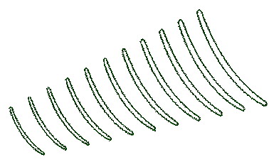 按设计给定数据绘制出各个平面上的截面线,叶盆和叶背上的型线均为自由曲线,进排气边缘为一段圆弧,将各曲线光滑过渡,并保证各段曲线的连续。根据给定的扭转角将各个平面上的曲线通过Xform—Rotate命令进行旋转,得到一组空间曲线,如下图所示(图4)。