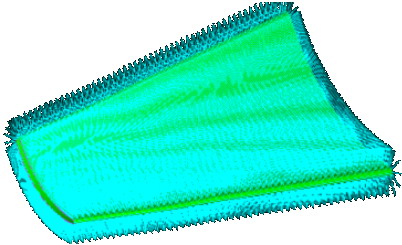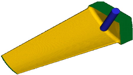 叶片的型面为自由曲面,毛坯为模锻件,需要进行半精加工和精加工。在半精加工中可以根据被加工的面生成偏置面。利用Mastercam中Toolpaths(刀具路径)—Multiaxis(多轴加工)—Msurf5ax(五轴曲面加工),选用曲面驱动,Cut Pattern(切削模式)、Tool Axis Control(刀轴控制)、Cut Surfaces(切削曲面)都选择被加工曲面。 选用直径为12的球刀加工,半精加工步距取1mm,精加工步距取0.3mm,余量为0.2mm,螺旋式走刀。精加工的刀轨路径如下图所示(图9)。