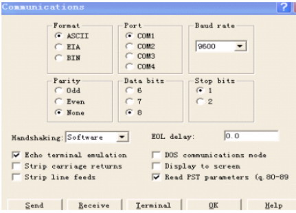 由于叶片型面程序量大,NC机床的磁泡存储器容量有限,常用PC机与NC机床RS232接口通讯。通过Mastercam中的Communications(通讯)功能,设置传输文件格式、串口,传输速率、奇偶校验、数据位等与CNC控制器的参数一致从而实现在线加工,如下图所示(图11)。
