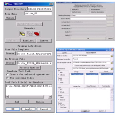Vericut提供了许多功能,其中有对毛坯尺寸、位置和方位的完全图形显示,可模拟2~5轴联动数控加工。现有的CAM平台都提供与Vericut的嵌入式接口或转换功能。如下图所示分别为UGNX、CATIA、Mastercam等平台与Vericut之间的转换设置,且它们可直接与Vericut进行嵌入式链接仿真,如Pro/Engineer、UGNX、CATIA、Mastercam平台等。其中UGII/Vericut 切削仿真模块是集成在UGII软件中的第三方模块,它采用人机交互方式模拟、检验和显示NC加工程序,是一种方便的验证数控程序的方法。由于省去了试切样件,可节省机床调试时间,减少刀具磨损和机床清理工作。通过定义被切零件的毛坯形状,调用NC刀位文件数据,就可检验由NC生成的刀具路径的正确性。UGII/Vericut可以显示出加工后并着色的零件模型,用户可以容易的检查出不正确的加工情况。如图9为UGNX、CATIA、Mastercam与Vericut的数据转换接口设置,图10为基于Vericut环境的机床加工仿真模拟,能帮助用户大幅度提高五坐标加工编程的效率和质量。