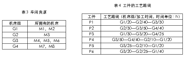 这里以一个实例来描述该系统。假设整个车间由8台机床组成,它们形成4个机床组,见表3。表4为待排的6批不同工件的工艺路线及其所需要的加工工时数。以工件P1为例,表明完成工件P1的加工需要经过3道工序,第一道工序由机床组G1中的机床来完成,所需加工时间是20h,第二道工序由机床组G2中的机床来完成,所需加工时间是40h,第三道工序由机床组G3中的机床来完成,所需加工时间是30h。作业计划仿真生成系统完成如下的工作: