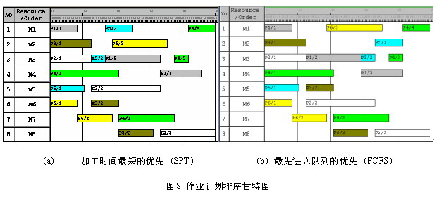 图8是以甘特图的形式展示的作业计划排序仿真生成结果,其中(a)中所采用的调度规则是SPT,(b)中所采用的则是FCFS。从机床M3中,反映出不同的优先规则对工件的排序的影响。P5的第2道工序与P1的第2道工序都在机床M3上完成,由于P5的加工时间(10h)比P1的加工时间(40h)要短,虽然P1比P5提前进入M3的排队队列,但遵循SPT的调度规则,因而在机床M3上,P5先于P1加工,如图8-(a)所示,而当遵循FCFS规则时,则在机床M3上,P1先于P5加工,如图8-(b)所示。