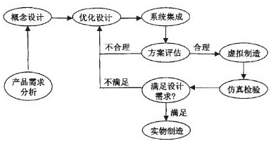 产品的虚拟设计技术(VirtualD esignT echnology)是面向数字化产品模型的原理、结构和性能在计算机上对产品进行设计,仿真多种制造方案,分析产品的结构性能和可装配性,以获得产品的设计评估和性能预测结果,从而优化产品设计和工艺设计,减少制造过程中可能出现的问题,以到达降低成本、缩短生产周期的目的。