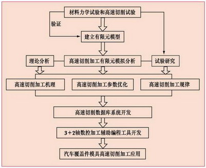 以有限元模拟技术和基于实例推理的高速切削数据库构建技术为研究支撑技术,以理论分析和试验研究等为辅助技术,对汽车模具尤其是覆盖件模具高速切削加工工艺展开深入研究。其研究过程为:首先进行材料力学性能试验,利用试验数据构建有限元模型,探讨高速切削加工机理,优化高速切削加工参数和揭示高速切削加工规律;基于优化的加工参数源数据和高速切削加工规律,采用实例推理方法建立高速切削数据库;研究具有复杂曲面特徵的汽车覆盖件模具保持近似恒定切削载荷的高速切削加工策略,突破3+2轴数控加工方式关键应用技术环节,开发汽车覆盖件模具3+2轴数控加工辅助编程工具,最后将这些成果在实际高速切削加工中进行应用。图1为研究路线示意图。