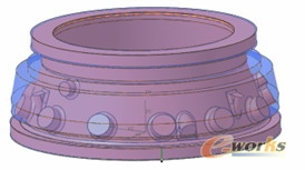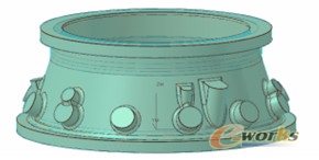 我们以某一实际加工机匣为例,结合数控工艺和NX软件铣加工的特点, 此机匣属于整体环形机匣,毛坯为整体锻件,完全靠机械加工的手段加工成型。材料为高温合金,硬度在 (40 – 45 HRC)之间,在加工中存在冷作硬化现象。壁厚较薄,零件容易变形,型腔壁厚为1.21mm结构较复杂,安装座较多,形状不规则,需五轴联动加工。此零件的部分设计图见图1。