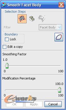 从某种程度来说,光顺的作用与简化相反,它通过增加三角面片的数量来使曲面更加光顺。在UG NX里,我们可以通过设定光顺因子(Smoothing Factor)和修正比(Modification Percentage)来控制光顺的结果。此外同样可以通过设定边界来对某一区域进行操作,其对话框如图5所示。