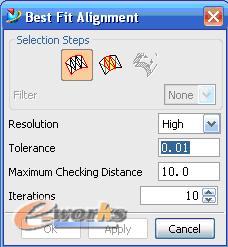 对齐操作又分为最佳逼近对齐(Best Fit Alignment,其对话框如图6所示)和点集与点集对齐(Point Set To Point Set Alignment)。最佳逼近对齐可以设置分辨率(Resolution)的高低。